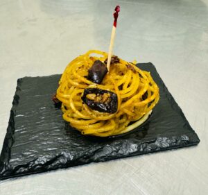 Tra i suoi piatti più apprezzati i vesuviotti del Pastificio Massa di Gragnano con salsiccia rossa di Castelpoto funghi porcini di Pietraroja e fonduta di pecorino del Taburno.